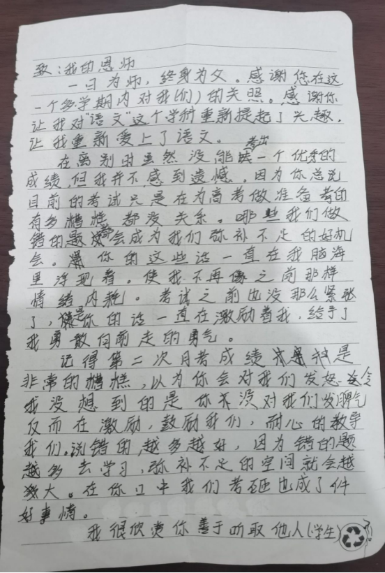 第二学期按选科分班级,班主任开完最后一次班会,我独自坐在教室角落,回忆本学期的授课一——美好且充实。在此刻也产生不舍之情,班会结束之际,应学生要求,我们一起合照。当目睹学生依依不舍地带上书本去往新班级,那一刻我红了眼,学生对我说“张老师,照顾好自己,以后不能为了上好课再熬夜备课了”。在那一刻,所有的留恋与不舍,都化为眼泪。此后我下定决心做一名学生喜欢、领导信赖、家长放心的好老师!