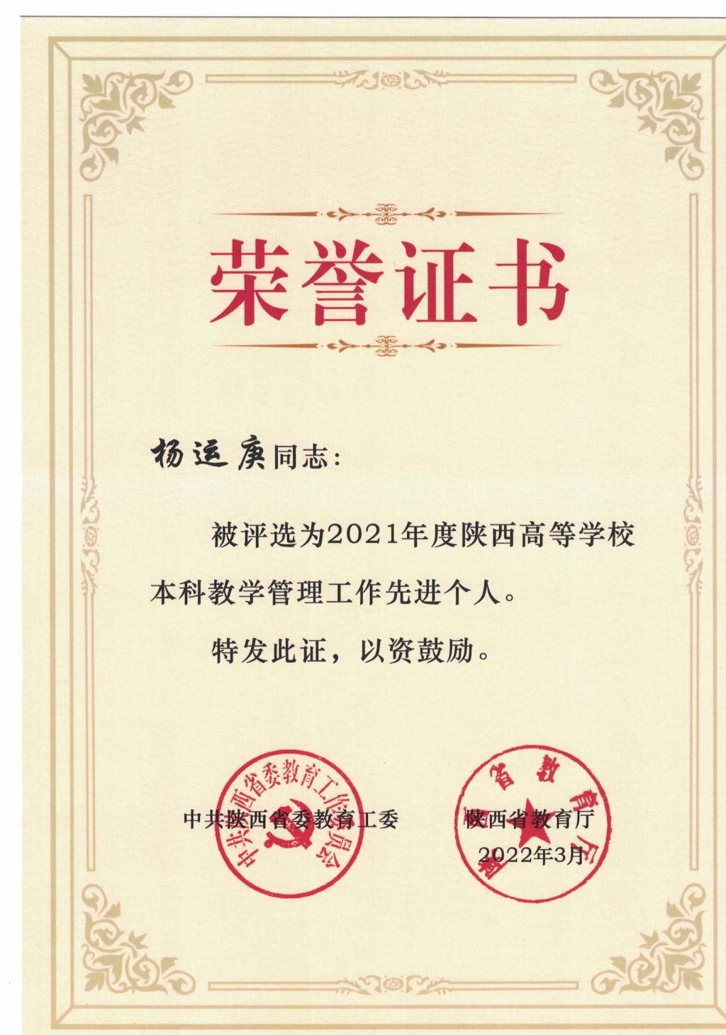 杨运庚被评为2021年度陕西高等学校本科教学管理工作先进个人