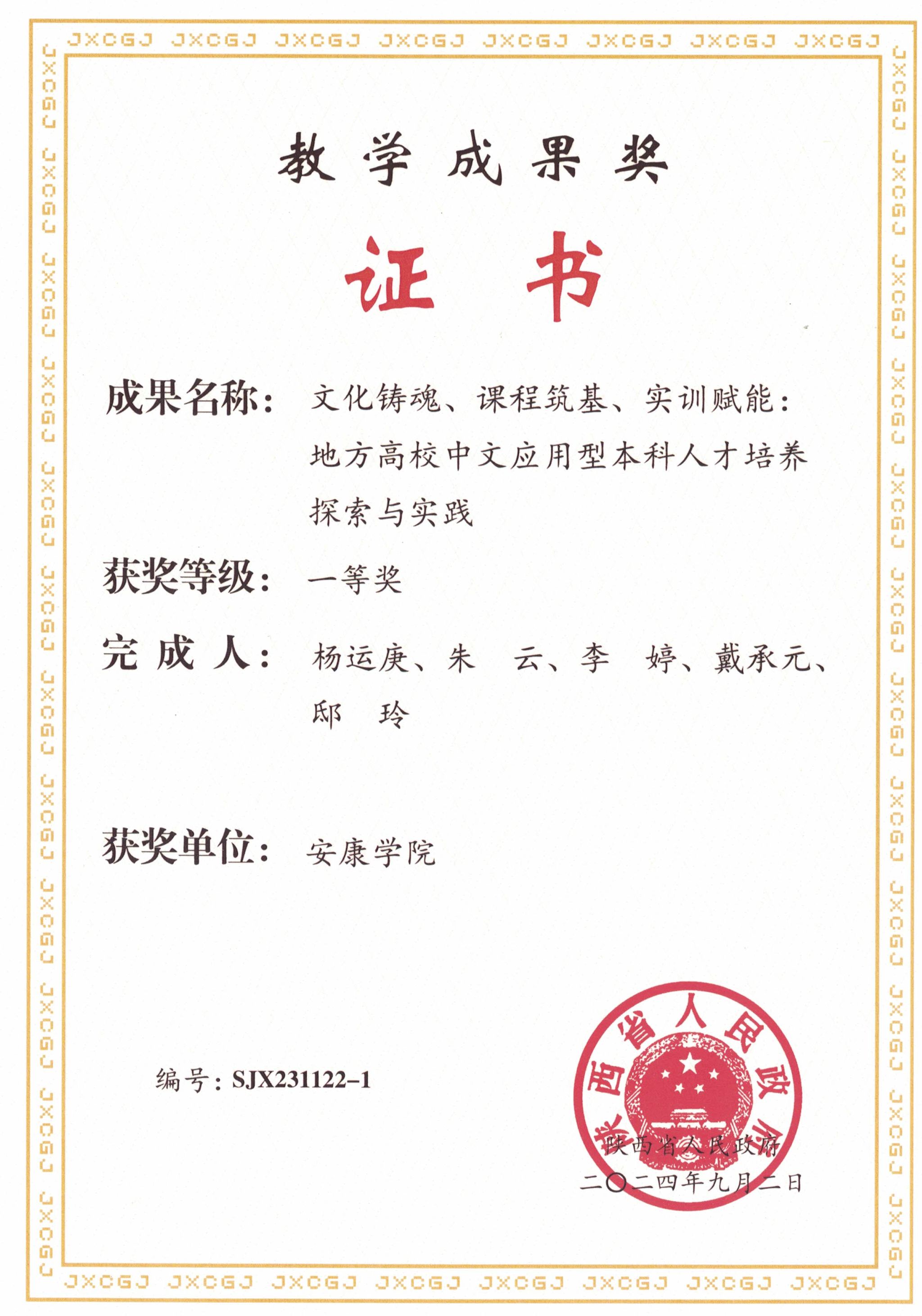 近日,陕西省人民政府发布了《陕西省人民政府办公厅关于表彰2023年高等教育教学成果奖获奖项目的通报》,伟德国际victor·1946源自杨运庚教授领衔申报的“文化铸魂、课程筑基、实训赋能:地方高校中文应用型本科人才培养探索与实践”荣获陕西省高等教育教学成果一等奖,获奖等次取得了新的重大突破,彰显了我院在中文应用型本科人才培养改革探索上取得的实效。