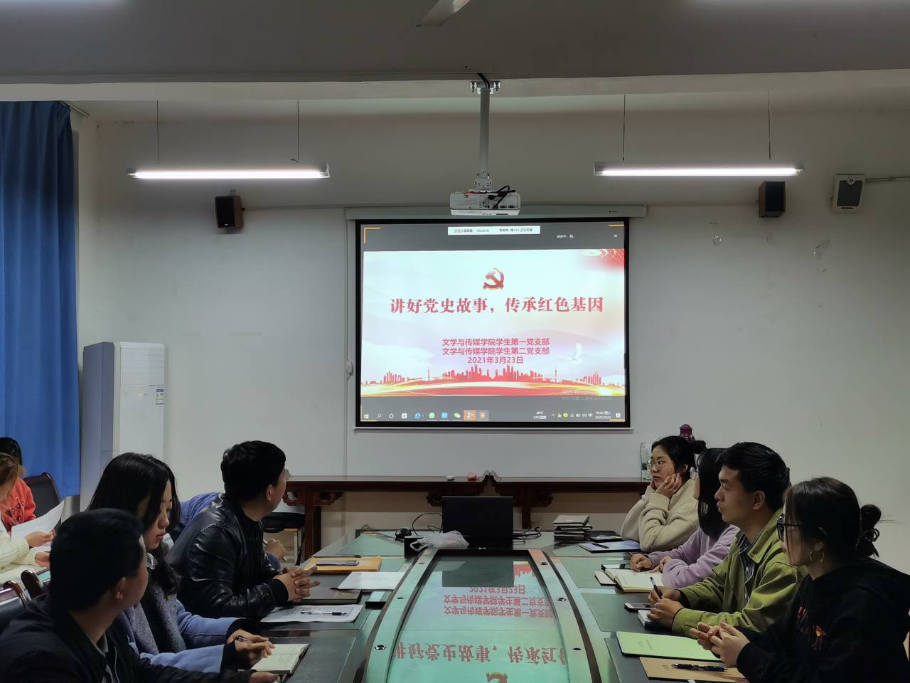 在庆祝中国共产党成立100周年之际,为深入学习贯彻习近平总书记在党史学习教育动员大会上的重要讲话精神,全面落实开展党史学习教育,引领学生党员增强政治责任感和历史使命感,从百年党史中汲取奋斗动力,从党史学习教育中凝聚力量,用实际行动诠释共产党人的初心使命,2021年3月23日晚上7:30,文传学院学生第一、第二党支部通过线上线下相结合的形式,联合开展“讲好党史故事,传承红色基因”主题党日活动。学生第一、第二党支部全体党员参加了本次活动。活动由学生第二党支部书记薛涛主持。