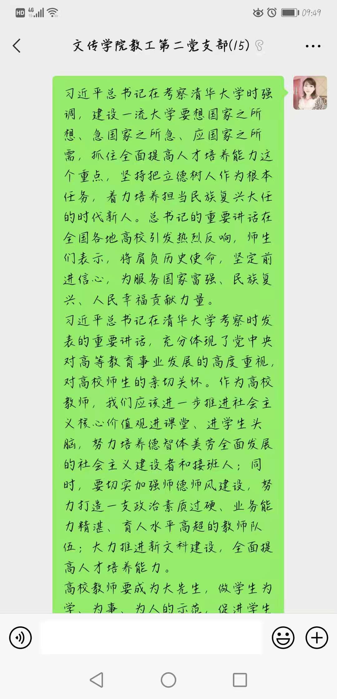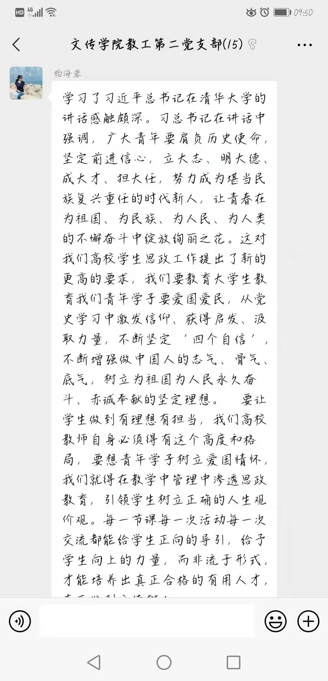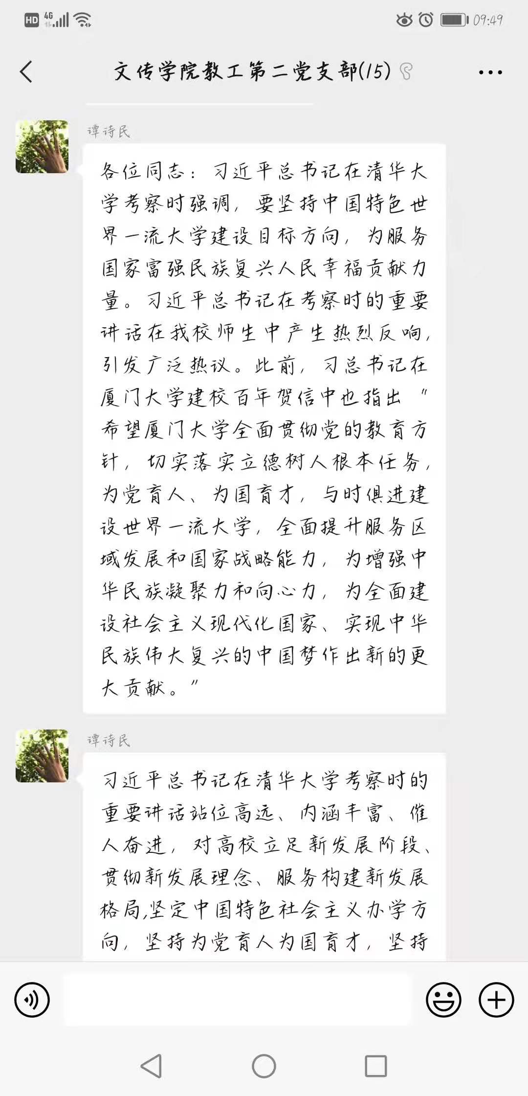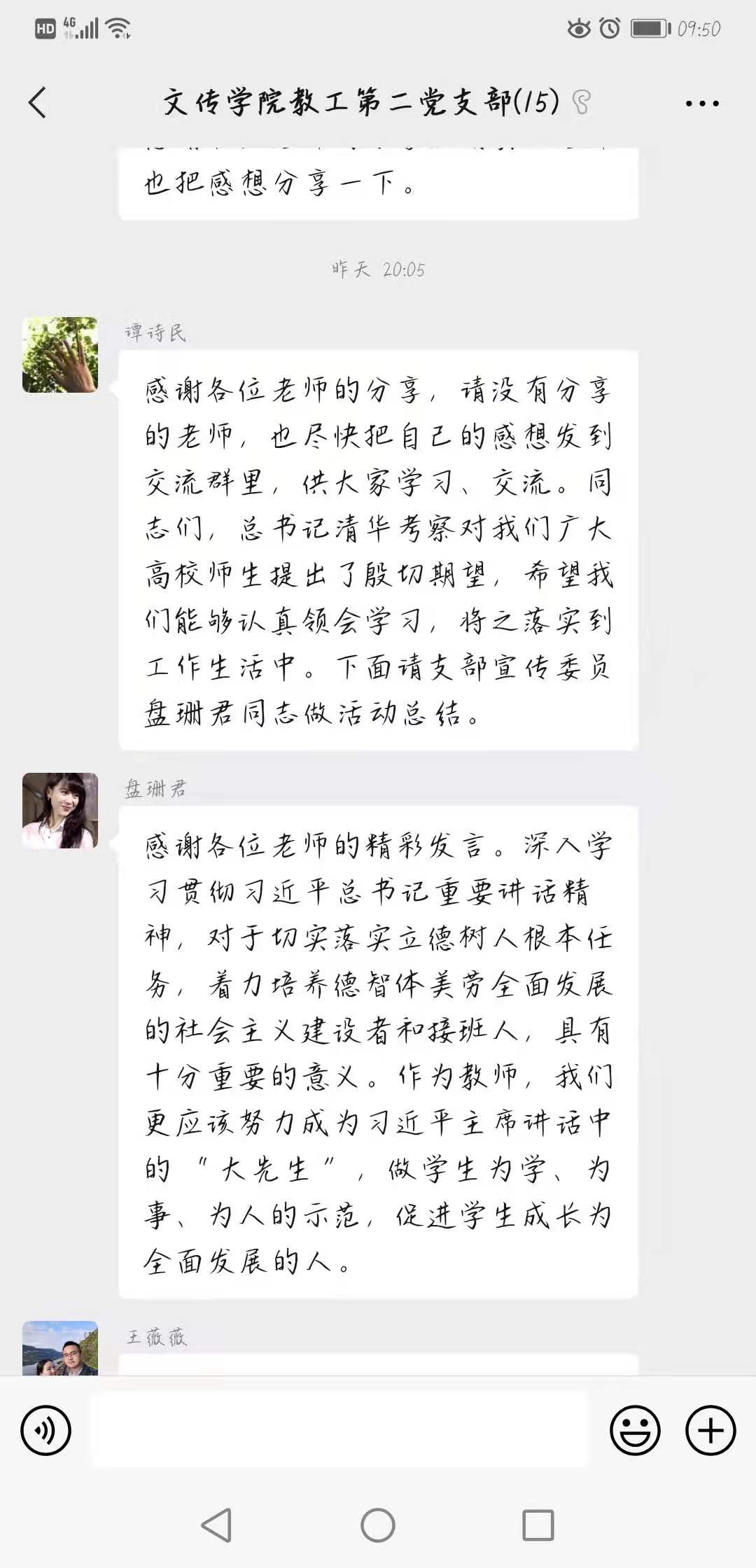 4月29日,文传学院教工二支部依托支部微信平台开展了“深入学习习近平总书记清华考察重要讲话,牢固树立高校‘立德树人’根本任务”主题党日活动。活动由教工二支部书记谭诗民主持,支部全体党员共同学习并参与讨论。