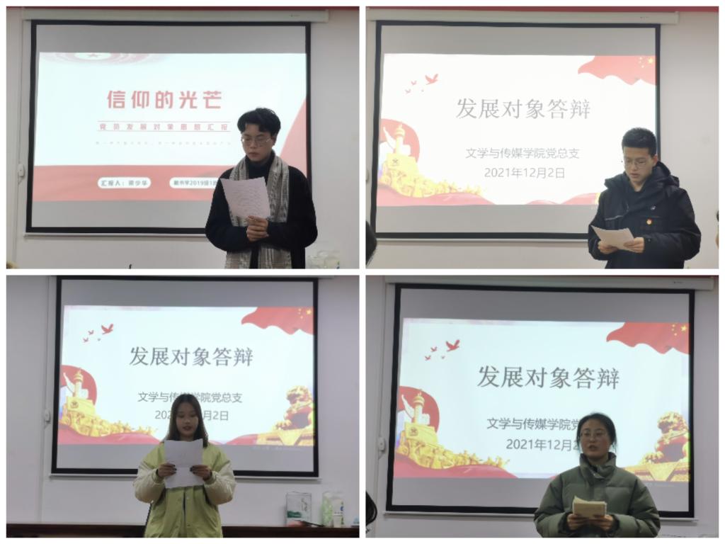 2021年12月2日16:00,文传学院学生党支部在2307会议室组织开展了文传学院2021年下半年发展对象述职答辩会,党总支副书记杨海蓉、学生第一党支部书记彭潇、学生第二党支部书记薛涛、辅导员邹棠华、学生支部委员及25名发展对象加本次答辩会。会议由薛涛主持。