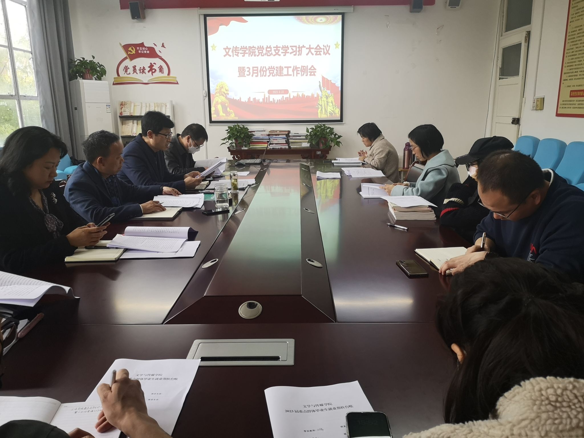 3月22日下午,文传学院在2307召开党总支学习扩大会暨3月党建工作例会,学院党总支委员、各党支部书记、支委委员、团总支书记、系主任参加会议,会议由党总支书记芦伟主持。