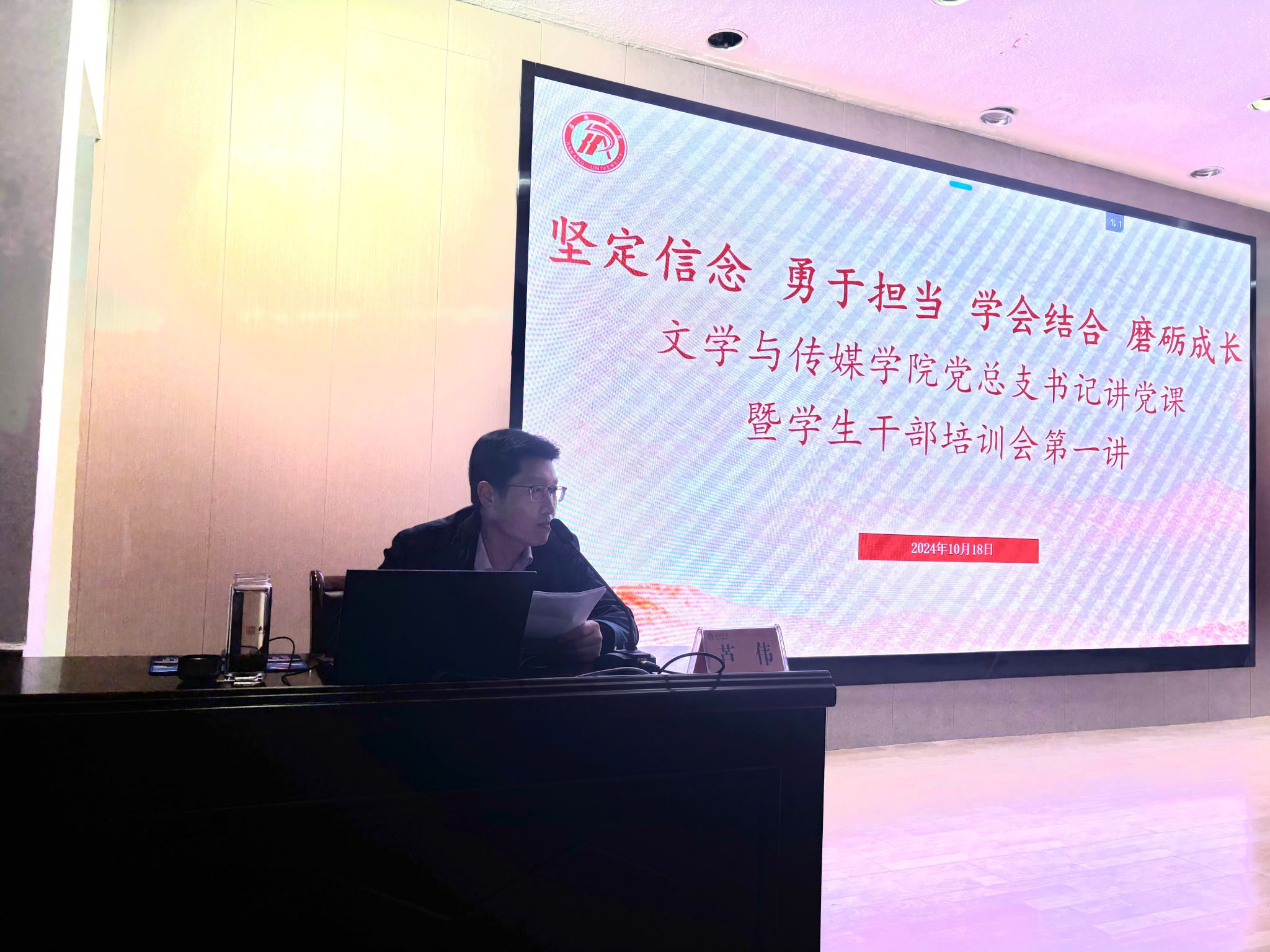 为认真贯彻落实习近平总书记在全国教育大会讲话精神,加强文传学院学生干部队伍建设,10月18日下午,文传学院在一号楼报告厅组织开展党总支书记讲党课暨学生干部培训第一讲,文传学院团总支学生干部、学生会学生干部及各班级班团干部参加培训会,文传学院党总支书记芦伟担任主讲嘉宾。