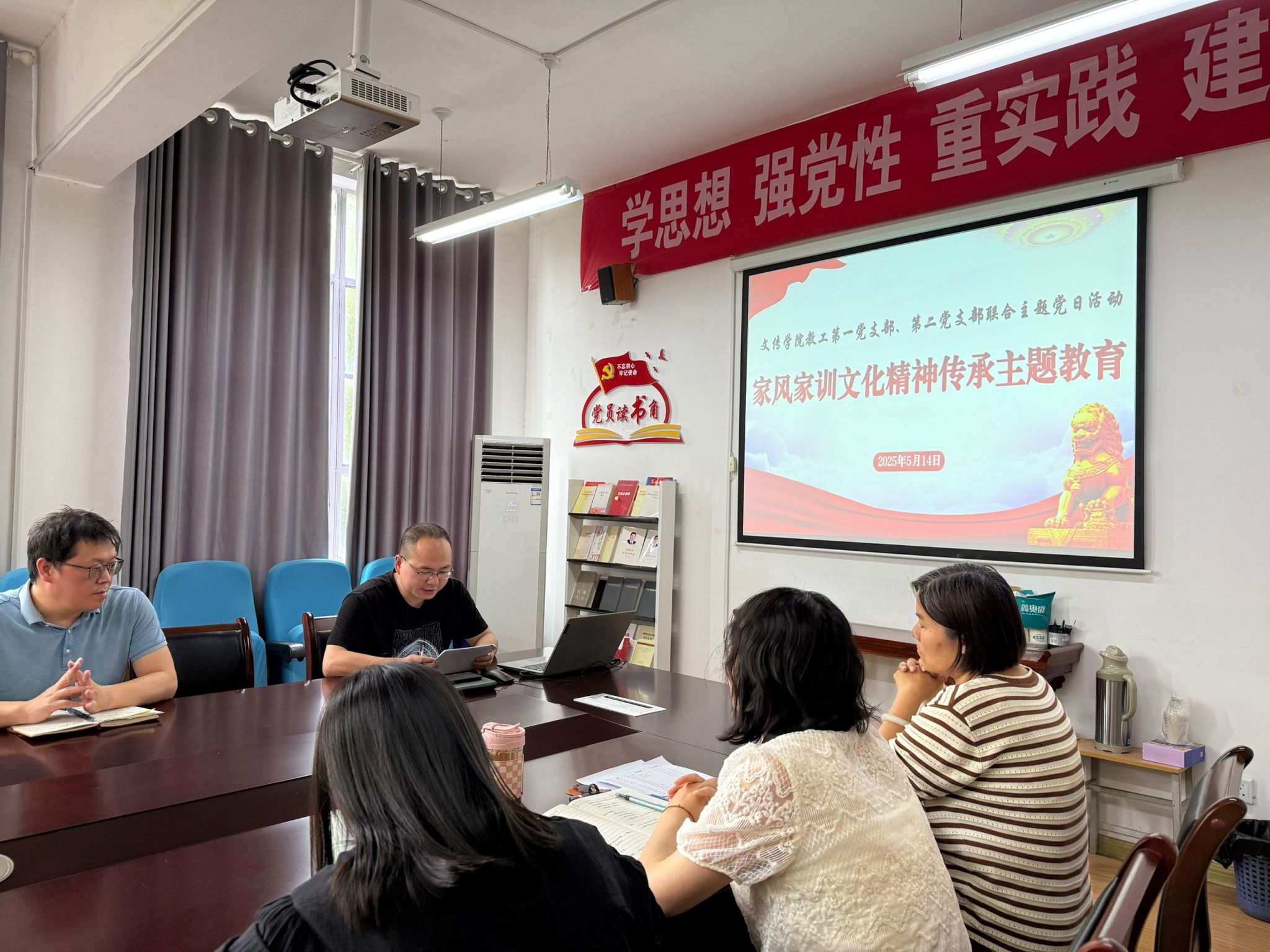 为深入学习贯彻习近平总书记关于注重家庭家教家风建设的重要论述,传承优良传统,弘扬时代新风,5月14日下午,文传学院教工第一、第二党支部在2307会议室联合开展“家风家训文化精神传承主题教育”主题党日活动,本次活动教工第一党支部书记韩文霞主持,谭诗民副教授主讲,全体党员教师参加。