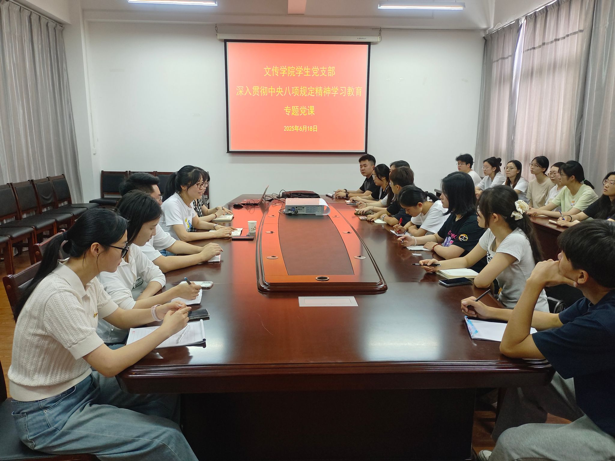 最后,文传学院党总支副书记侯红艳以“锲而不舍落实中央八项规定精神,以优良作风带动学习提质增效”为题讲专题党课,她全面介绍了深入贯彻中央八项规定精神学习教育的重大意义和精准把握学习教育目标任务的核心要义,就如何深入贯彻中央八项规定精神,她向全体学生党员提出三点希望:一是在强化学习中锤炼党性修养。二是在奋力笃行中提升自身本领。三是在感恩生活中增强责任担当。