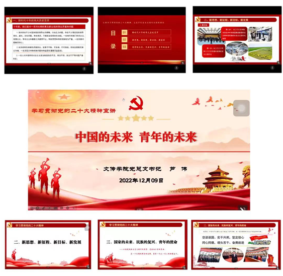 为促进青年学子学习贯彻党的二十大精神,进一步深刻领会习近平新时代中国特色社会主义思想,加强青年学生的培养、凝聚青年学生力量,引导青年担当时代责任。12月9日晚,学院党总支书记芦伟以“中国的未来 青年的未来”为题,为2022级学生宣讲党的二十大精神暨新生入学教育第六讲。本次宣讲会通过腾讯会议召开,会议由辅导员李欣逸主持。