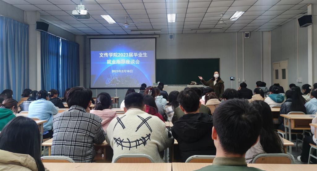 2023年2月16日下午,文传学院在1012教室召开汉语言文学、网络与新媒体专业2023届毕业生就业指导座谈会,汉语言文学、网络与新媒体专业2019级全体在校生参会,会议由辅导员老师彭潇主持。
