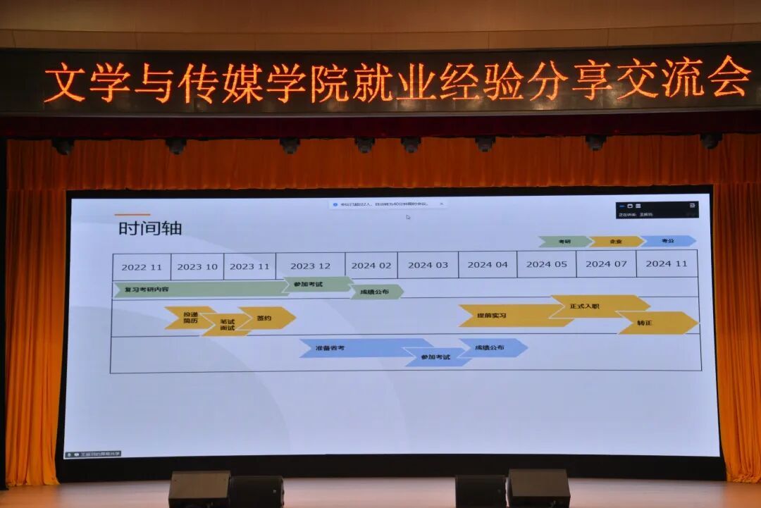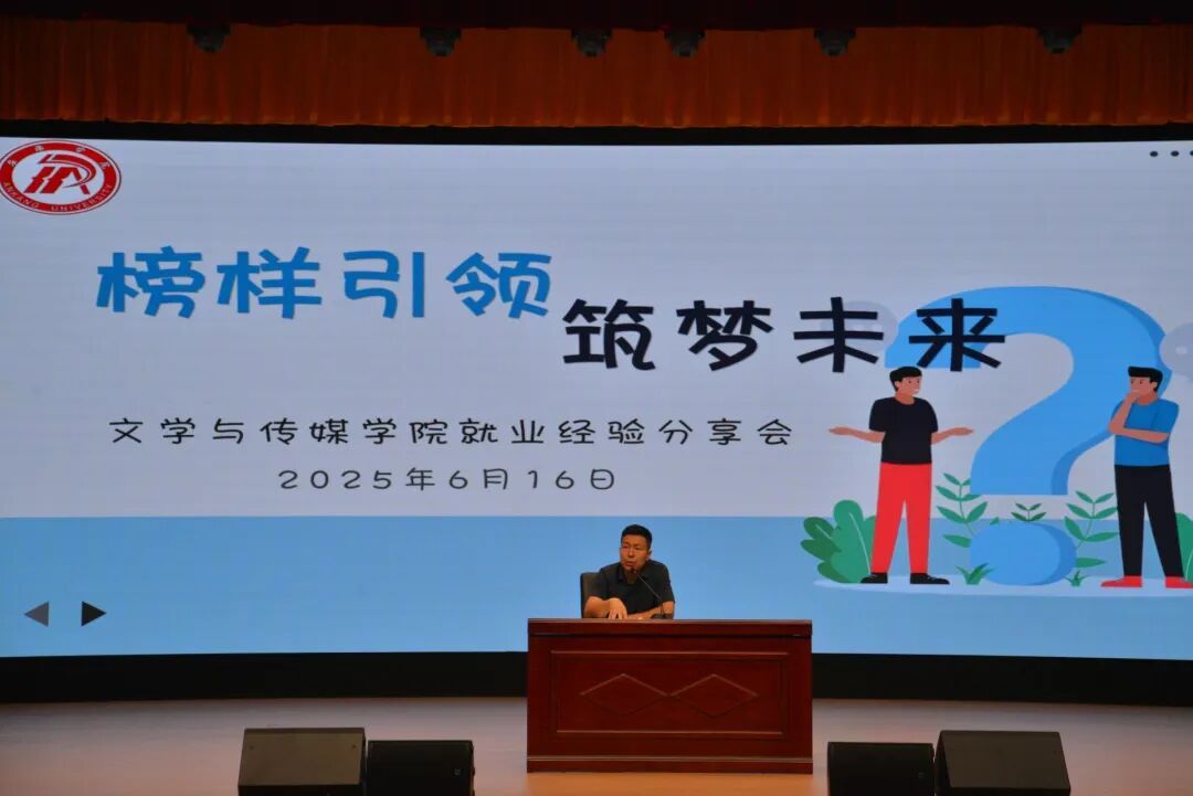 为帮助2026届学生明晰职业规划,提升就业竞争力,6月16日晚7:00,伟德国际victor·1946源自在江南校区大礼堂组织开展“榜样引领,筑梦未来”就业经验分享交流会,特邀网络与新媒体2019级1班陈乐欣、汉语言文学2020级3班王振羽、秘书学2020级1班郭杨三位校友以线上形式进行分享。我院学工办主任薛涛、辅导员彭潇及2022级全体同学参加活动,活动由薛涛主持。