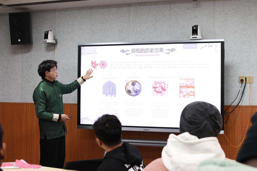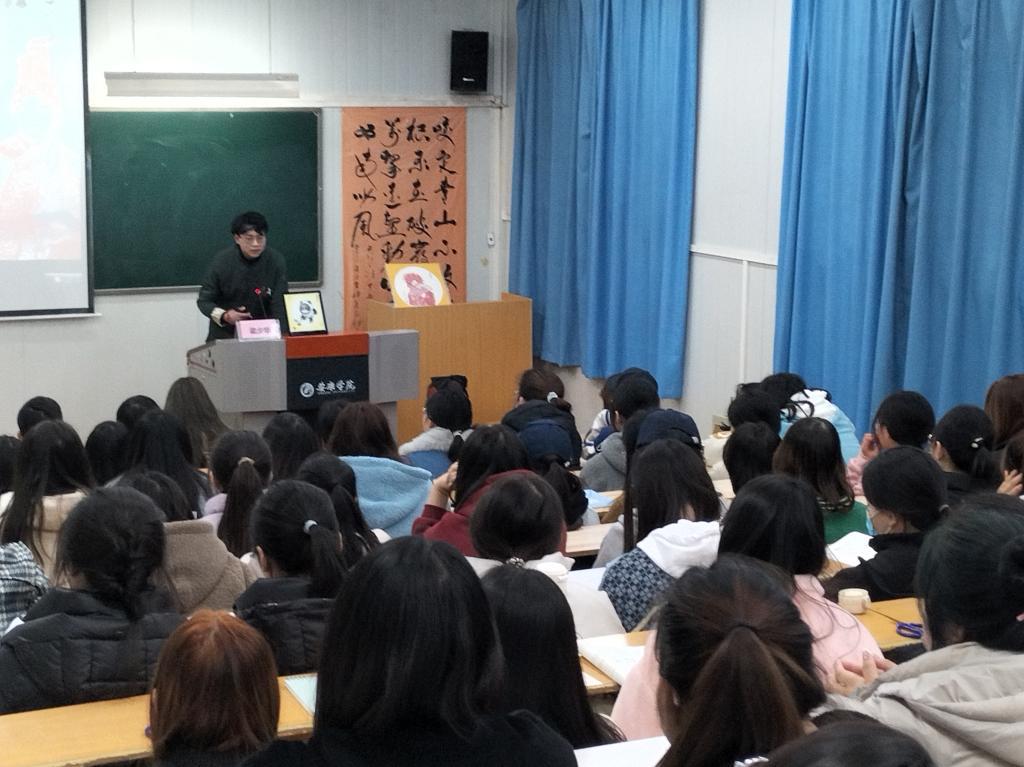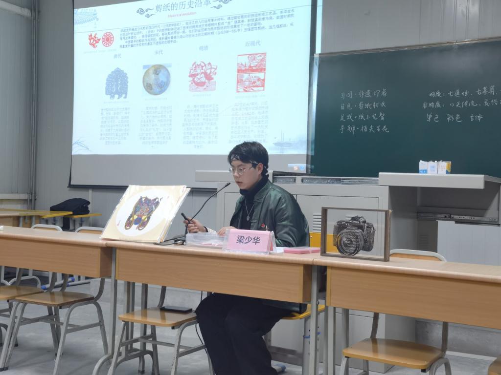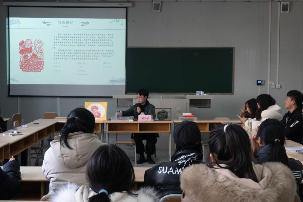 梁少华凭借前两场讲座的成功经验,积极向所在学院提出了他的“非遗进校园”的大胆设想,他想用自己手中的剪刀和纸去感染更多的年轻大学生。在文传学院的大力支持与策划联络下,2021—2022学年,梁少华在全校各二级学院先后开办了13场“非遗”大课,共有1000余名学生到场聆听,参与剪纸互动。他的讲座,不仅为同学们展示了非遗文化的时代风貌,创建了特色课堂,也成为了一种形式新颖、生动有趣、增进青年大学生文化自信的爱国主义教育课,