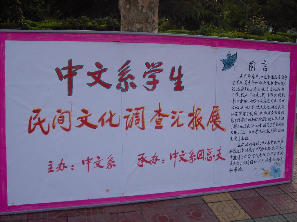 为了增强学生对各地民俗、文化的了解,加强爱国主义教育,同时也为了拓宽学生的知识视野、培养学生的科研兴趣、提高学生的科研能力,在春节前夕,中文系团总支倡导、组织全系学生利用春节就近在家乡进行地方文化、民俗调查。学生积极性很高,纷纷深入社区、乡村展开调查,调查的内容涉及地方风俗民情、文物古迹、民间工艺、地方饮食、民间曲艺、民间传说等各个领域。截止三月底共收到调查报告600余份。系领导对同学们的热情和工作给予了高度重视和充分肯定,要求系团总支将优秀稿件展出。在全体团干部的精心筛选下,共选出优秀调查报告176份,于四月十九日在校园展出,引起全院学生广泛关注。这项活动对推动我院学生科技创新、活跃校园文化生活起到了很好的推动作用。