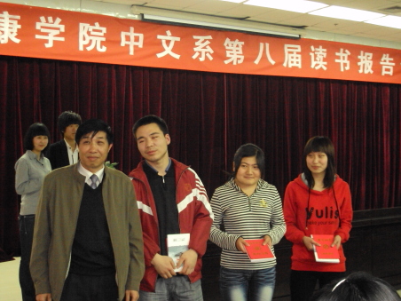 导航痕迹 首页 > 新闻通知 > 学院新闻 > 正文 学院新闻 通知公告 世界读书日献礼 发布人: 发布日期:2010年04月27日 阅读次数: 为迎接第十五个世界读书日,中文系系一年一度的读书报告会于2010年4月22日下午4:00在图书馆六楼报告厅隆重举行。此次大会由伟德国际victor1946中文系主办,学院社团联合会与国学读书社承办。参加此次报告会的有中文系党总支书记沈军、著名作家李春平、 中文系副教授王瑛以及中文系全体辅导员。 经过前两轮的初赛和复赛后,共有八名同学进入本次决赛。八位同学参赛的作品范围广泛,包括战争、爱情、励志等方面;体裁多样,有诗歌、戏剧、小说等。决赛中几位同学分别就个人对《秦腔》、《雷雨》、《巴黎圣母院》、《我的大学》、《击鼓》、《穆斯林的葬礼》、《伪满洲国》、《围城》八部著作中的认识价值、道德伦理价值、教育价值、政治价值、经济价值等方面谈了自己的心得体会。李春平作家和王瑛老师分别对他们的参赛作品一一进行了精彩点评。现场气氛也因此时而活跃,时而严肃,时而安静,时而激动,报告厅中掌声不断。两位评委老师就目前各参赛同学在现有阅读量和人生阅历的背景下对文学文本的精彩解读感到欣慰,同时还特别希望同学们在解读文学作品的时候,要注意既要能走进去也要能跳出来,要试图从作品、读者、艺术和文化等不同的角度去解读文学文本。 08级语文教育(1)班的冯鸣和08级汉语言文学(2)班的冯友芳成绩不相上下。评委老师商议通过现场提问的方式以分伯仲并敲定最终决赛结果:冯鸣获得此次读书报告会的第一名,冯友芳和赵云并列第二,刘庆春、汪菲菲、杨谋德获得第三名,陈昱洁和曲婉蓉获得优秀奖。