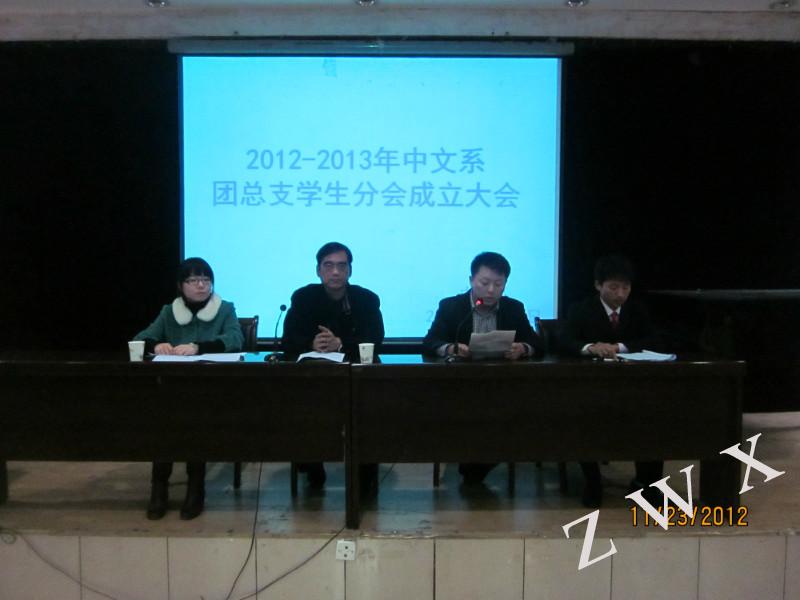 2012年11月23日晚8点,伟德国际victor1946中文系2012-2013学年度团总支学生分会成立大会在一号楼六楼报告厅正式举行。到会的有中文系党总支书记李岩、团总支书记沈菲;2011-2012学年度团总支学生分会主席团及各部部长、2012-2013学年度团总支学生分会主席团、各部部长及全体干事。成立大会在全体到会人员合唱国歌的旋律中拉开序幕。