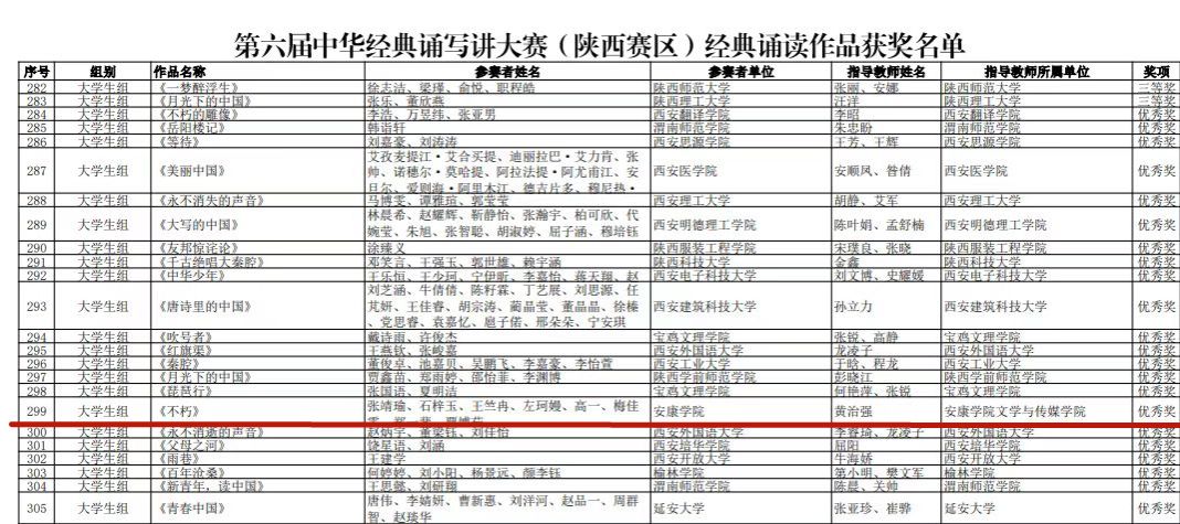 经过前期遴选,确定由我院黄治强老师指导的《不朽》《梦想照亮中国》两组诗歌朗诵作品报送参加陕西赛区经典诵读比赛。其中,由我院选送、汉语言文学专业2023级5班张靖瑜、石梓玉、郑一斐、贾博茹、梅佳雯、高一、王竺冉、左珂曼排演的朗诵作品《不朽》经过层层选拔,在全省101个大学生经典诵读比赛中脱颖而出,荣获优秀奖。