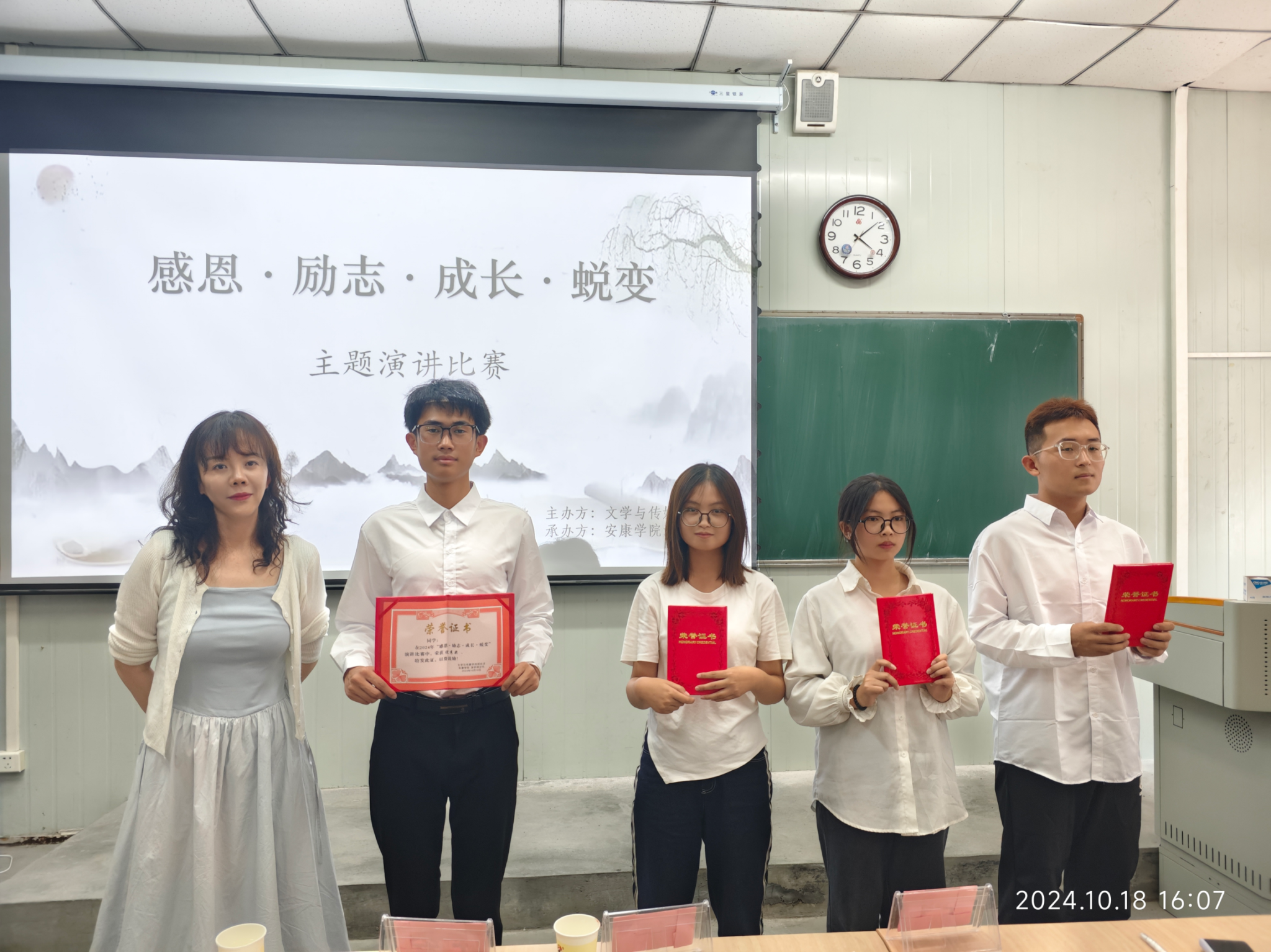 评委老师为获奖同学颁发荣誉证书,并合影留念。