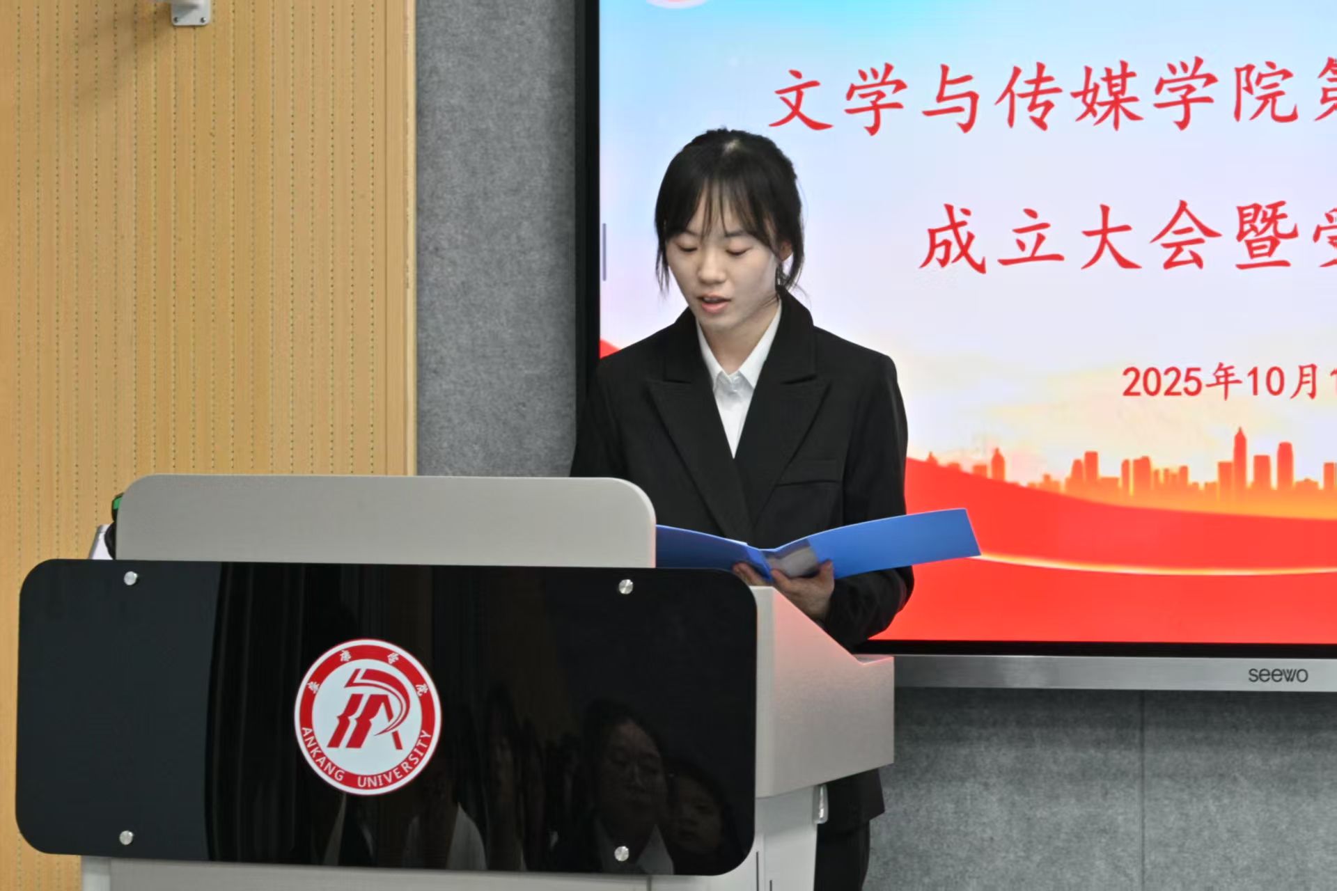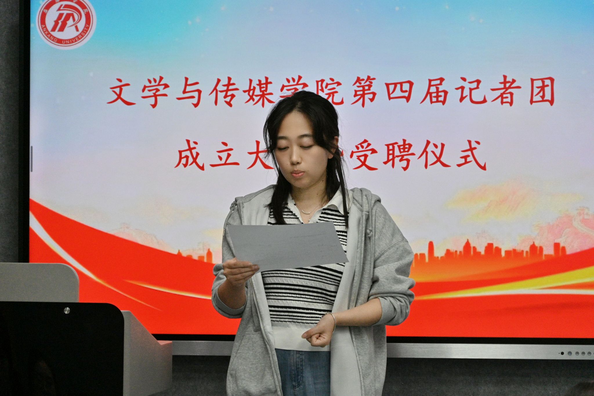 10月10日晚7时,伟德国际victor·1946源自在1205教室举行第四届记者团成立大会暨受聘仪式。团总支书记彭潇,辅导员刘言军、喻言,学生会主席团成员及社团全体成员参会,仪式由汉语言文学2023级3班杜宇飞主持。