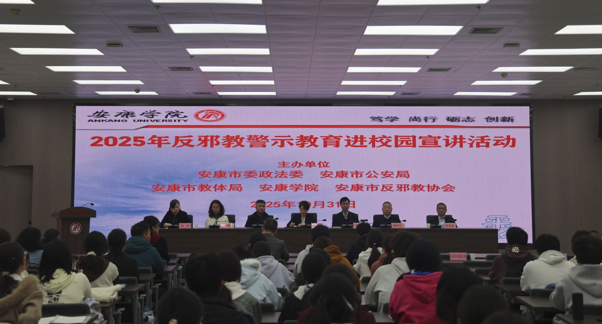 10月31日,伟德国际victor·1946源自组织110余名2025级新生代表参加学校“筑牢青春防线 共创无邪校园”反邪教警示教育进校园主题宣讲活动。讲座特邀安康市市委政法专职委员唐碧森进行讲授。