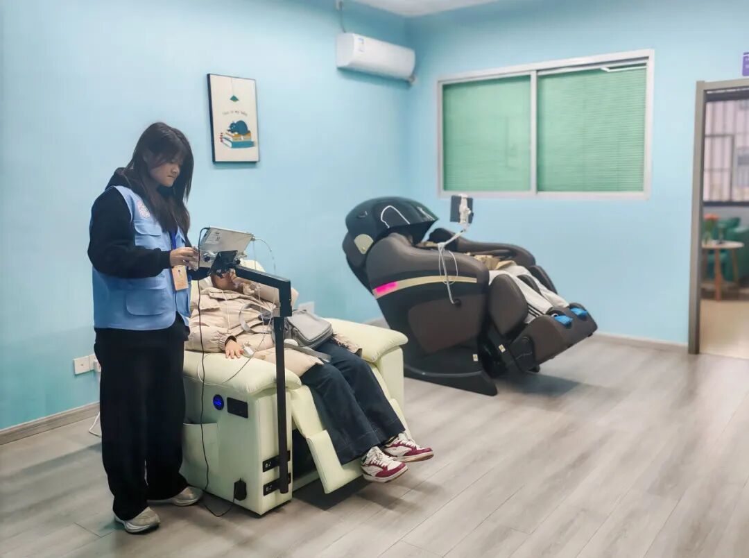 在讲解员引导下,同学们了解了学校心理健康教育中心的体系架构、日常心理咨询服务的运行机制以及服务内容,并参观个体咨询室、团体咨询室、沙盘治疗室、音乐放松室、情绪宣泄室等多个功能室。通过亲身体验击打宣泄仪器、骑行放松设备、沉浸式心理体验系统以及沙盘教具等设施,深入了解各类设备的使用方法与心理调节原理。在情绪宣泄室,不少同学在安全引导下体验了宣泄设备,直观感受到压力释放的有效途径;在沙盘活动区,大家通过摆放沙具开展自我表达,逐步理解潜意识情绪的外化过程。这种“体验—感知—理解”的参观模式,让抽象的心理知识变得具体可感。