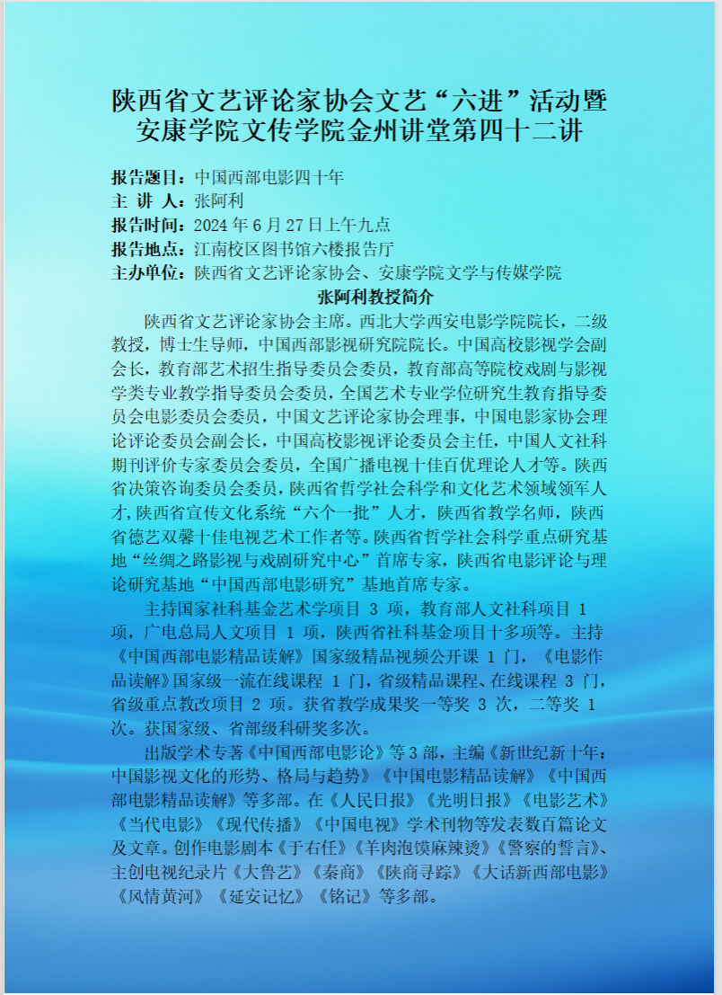 导航痕迹 首页 > 新闻通知 > 通知公告 > 正文 学院新闻 通知公告 陕西省文艺评论家协会文艺“六进”活动暨伟德国际victor1946文传学院金州讲堂第四十二讲 发布人:文传学院 发布日期:2024年06月26日 阅读次数: