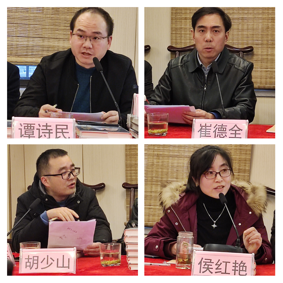 戴承元以《蜀河有幸遇知音》为题,提出《蜀河口》是第一部全景式地再现蜀河口的山水自然、人文历史、民俗风情的长篇小说,是大著述,小说主题鲜明宏大,叙事细致周详,人物形象真实生动,不足之处在于虚构想象不够、民俗描写冗长、叙事节奏缓慢。杨明贵认为这部小说人物塑造立体多面,展现了一群善恶相间的杂色调人物群像,具有极高的思想文化价值和艺术价值,建议借鉴章回体手法为每一章节选取题目。侯红艳以《<蜀河口>方言运用的美学意蕴》为题重点关注了这部小说中的方言书写,分析其在展现地域文化特征和“陌生化”表达效果的美学意蕴。曹刚以《地方性写作的可能与限度》为题,认为小说不仅仅是一部描写蜀河这一有限地理空间的地域性文学作品,而是具有向内“深描”蜀河口历史传统、人际交往、饮食习惯、服饰特征、思维方式等民族志处理。崔德全以《旧航道与新征程》为题对作品中所展示出来的人类社会与自然地理、个体命运与社会趋势之间的关系进行论述。谭诗民把《蜀河口》比喻为家乡菜、摇篮曲、纪录片,认为小说是一部乡土史、融合史、兴衰史,同时也指出小说中存在心理描写欠缺,人物思想性格转换太快等可供改进之处。胡少山以《乡土小说历史叙事的重要收获》为题,指出小说是丰富精彩的日常生活的呈现、是“赤子之心书乡愁”的一曲家乡赞歌,小说文本的叙事节奏波澜不惊,尤其是对那如诗如画的优美景物和充满人情味的风俗民情的描绘让人对蜀河口充满着神往。我院教师在主题发言过程中,评论视角多元,不同观点之间相互碰撞,将此次研讨会的气氛推向高潮,会后受到两位作者及与会其他专家学者的高度评价。
