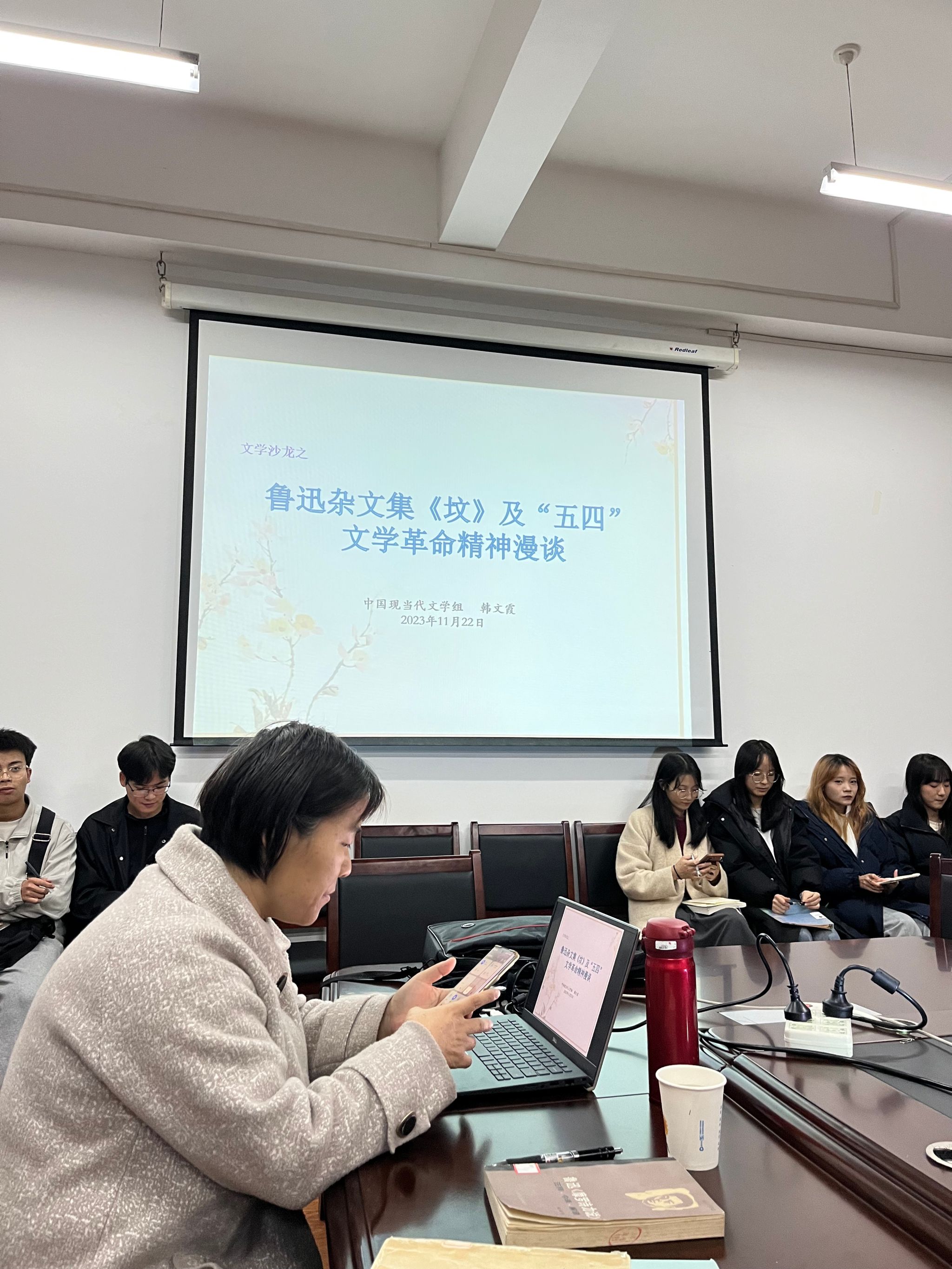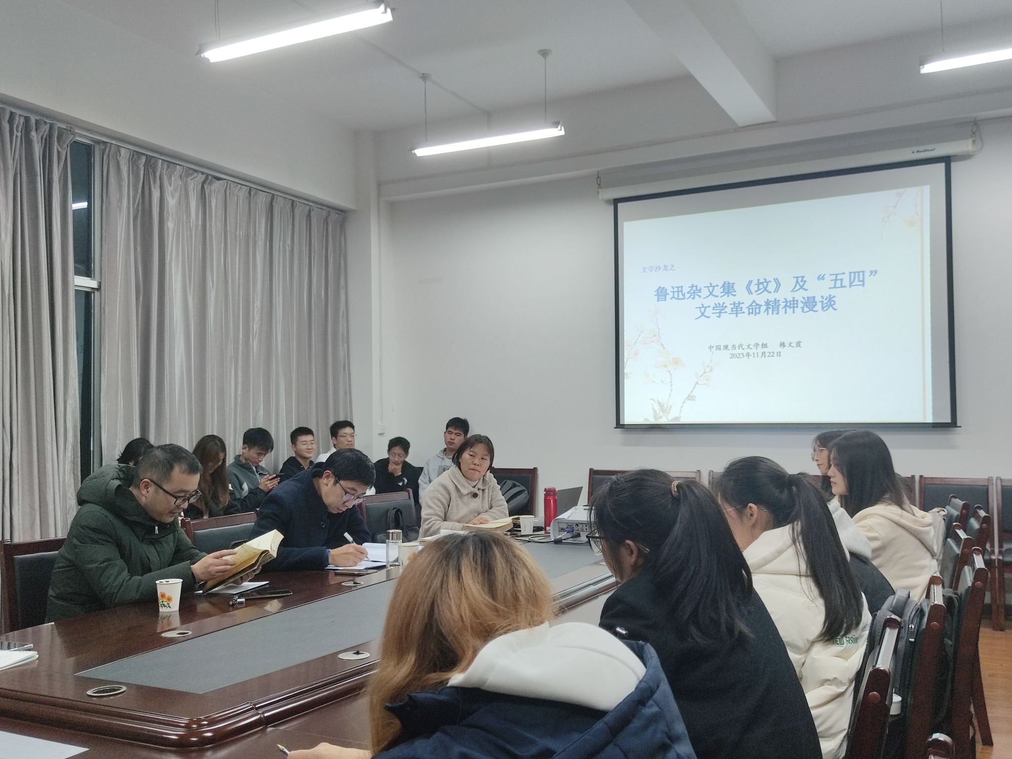 11月22日晚7点10分,伟德国际victor·1946源自中国现当代文学学科组在陕南民间文化研究中心会议室成功举办了第八届“学术沙龙”活动周第二场沙龙。本场学术沙龙由韩文霞主讲,主题为“鲁迅杂文集《坟》及‘五四’文学革命精神漫谈”。文传学院副院长曹刚、专任教师胡少山和二十余名学生参与了沙龙活动,沙龙由曹刚主持。
