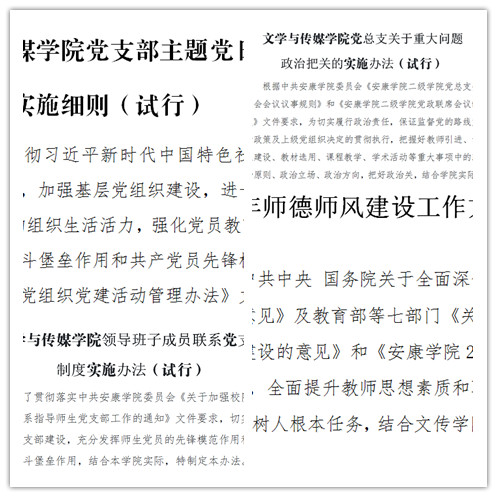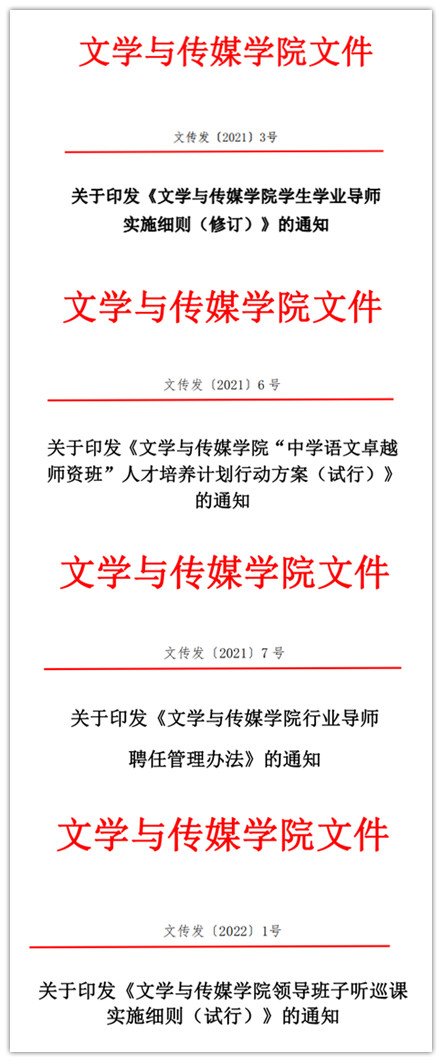 学院先后出台《伟德国际victor·1946源自党建工作制度汇编》《伟德国际victor·1946源自党风廉政建设责任制实施办法(试行)》《伟德国际victor·1946源自党支部主题党日活动实施细则(试行)》《伟德国际victor·1946源自党总支关于重大问题政治把关的实施办法(试行)》《伟德国际victor·1946源自领导班子成员联系党支部制度实施办法(试行)》《文传学院师生交流日制度》《文传学院2022年师德师风建设工作方案》《2021年伟德国际victor·1946源自学生学业导师实施细则(修订)》《伟德国际victor·1946源自行业导师聘任管理办法》《伟德国际victor·1946源自“中学语文卓越师资班”人才培养计划行动方案(试行)》《伟德国际victor·1946源自领导干部听评课实施细则(试行)》等制度、方案,进一步加强和规范学院党建工作、教学科研工作、师德师风建设等多项工作。