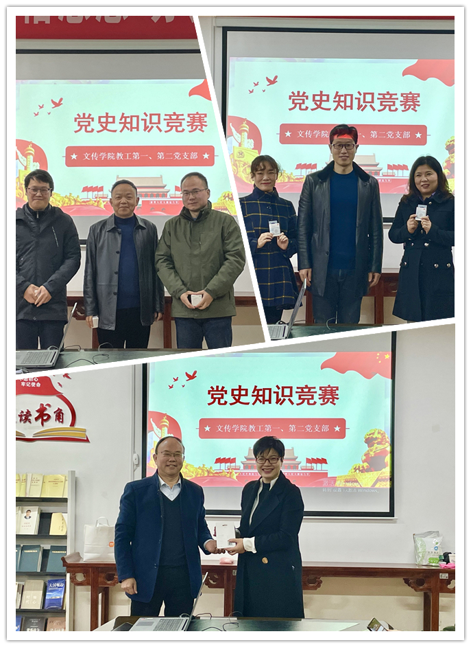 学院党总支加强对党支部工作的督促指导,努力提升党支部建设质量。党支部活动形式创新、内容走深,将党员读书活动融入“三会一课”,开展了“评红色电影、悟家国情怀、守初心担使命”“党史知识竞答”“寻访红色足迹 传承革命精神”“明史崇德、砥砺前行——从红色家书中汲取前进的智慧和力量”等主题党日活动,持续推进“两学一做”学习教育常态化制度化。扎实推进党建品牌引领工程,教工党支部“家和风正”基层党建特色品牌建设项目顺利结题,党员教师积极投入《中国传统家训》线上公选课拍摄录制和家风馆建设、《中国传统家训干部读本》编撰中,持续传播好家风;学生党支部“室雅书香”培育项目与党史学习教育、学风建设、文明宿舍深度融合,活动形式更加丰富多彩。与机关三直属党支部结对共建,联合开展“学党史、悟思想、助振兴”红色文化演出走进美丽乡村活动。党员先锋模范作用进一步彰显,党员教师中涌现出了“陕西高等学校教学名师奖”“师德先进个人”“优秀教师”“优秀共产党员”“优秀党务工作者”等一批先进典型,获批了“省级新文科研究与实践项目”“线下一流课程”“线上一流课程”“陕西省第三届高校课堂教学创新大赛(本科)”“陕西省2019年高等教学教学成果奖”一批标志性项目和奖项。在2021年校党委“两优一先”表彰大会上,文传学院党总支获得“先进基层党组织”荣誉称号。