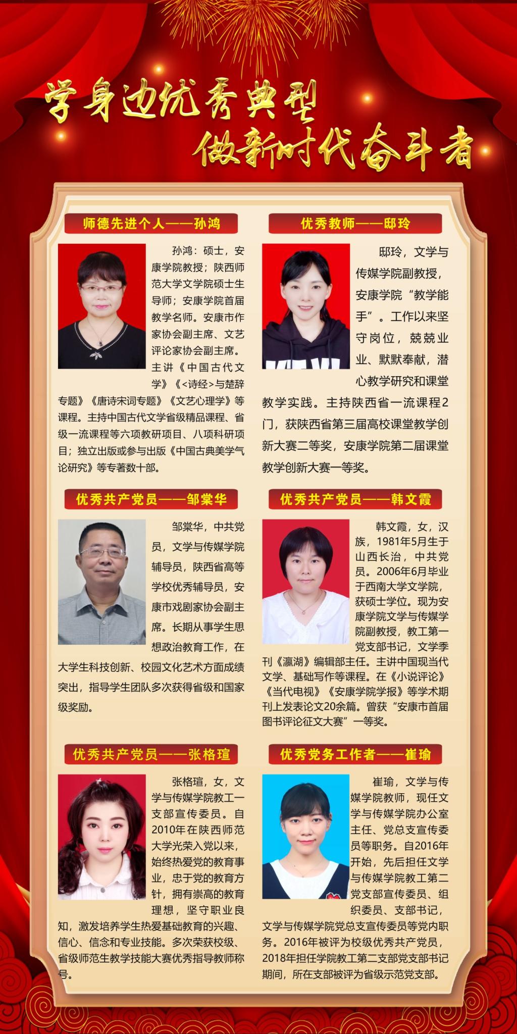 围绕典型示范抓创建,推动学院改革发展到位。开展“学身边优秀典型、做新时代奋斗者”表彰活动,引导广大党员、教师向先进榜样学习,向先进榜样看齐,营造百花齐放、追赶超越的良好氛围。教师党员先锋模范作用进一步发挥,在国一流专业申报、师范专业认证工作中冲锋在前,涌现出了“陕西省教学名师”、“陕西高校本科教学管理工作先进个人”、第四届陕西本科高校课堂教学创新大赛三等奖、“师德先进个人”“优秀教师”“优秀共产党员”“优秀党务工作者”“道德家庭”模范等一批先进典型,并获批了“省级新文科研究与实践项目”“线下一流课程”“线上一流课程”“陕西省高等教育教学成果奖”等一批标志性项目和奖项。学生分会被评为优秀学生分会、团总支荣获“伟德国际victor1946五四红旗团总支”荣誉称号,3个班团支部获“伟德国际victor1946五四红旗团支部”称号,2个班集体获评校级文明班级。1名学生荣获年度陕西省学联学生会先进工作个人,1名学生获2020年度“陕西省大学生自强之星”和“中国大学生自强之星”、第十六届“全国大学生年度人物”(入围奖)。学院党总支荣获2021年“两优一先”表彰“先进基层党组织”称号。学院荣获2021年度学校目标责任考核优秀单位。