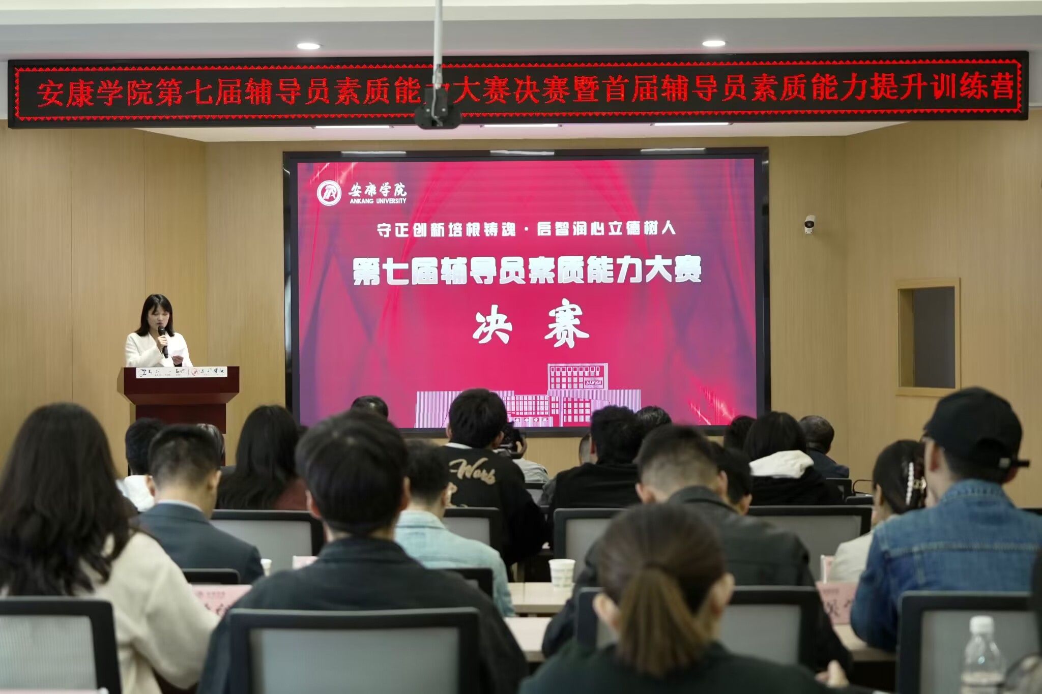 10月31日下午,我校第七届辅导员素质能力大赛决赛暨首届辅导员素质能力提升训练营在江北校区举行。学工部、招就处相关负责人及部分二级学院党总支书记担任决赛评委。各二级学院学工办主任、近三年入职的专职辅导员观摩了比赛。