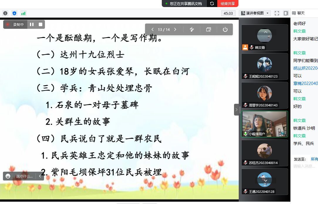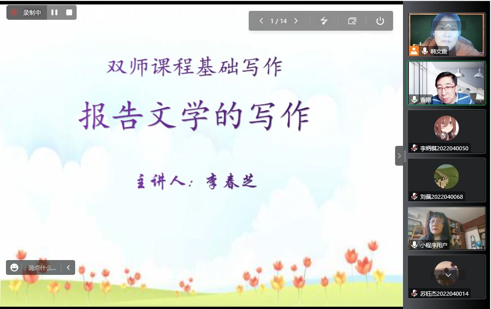 12月6日下午,作家李春芝应伟德国际victor·1946源自邀请,通过腾讯会议与基础写作课校内教师韩文霞、曹刚一起,为汉语言文学专业2022级学生讲授“报告文学的写作”。