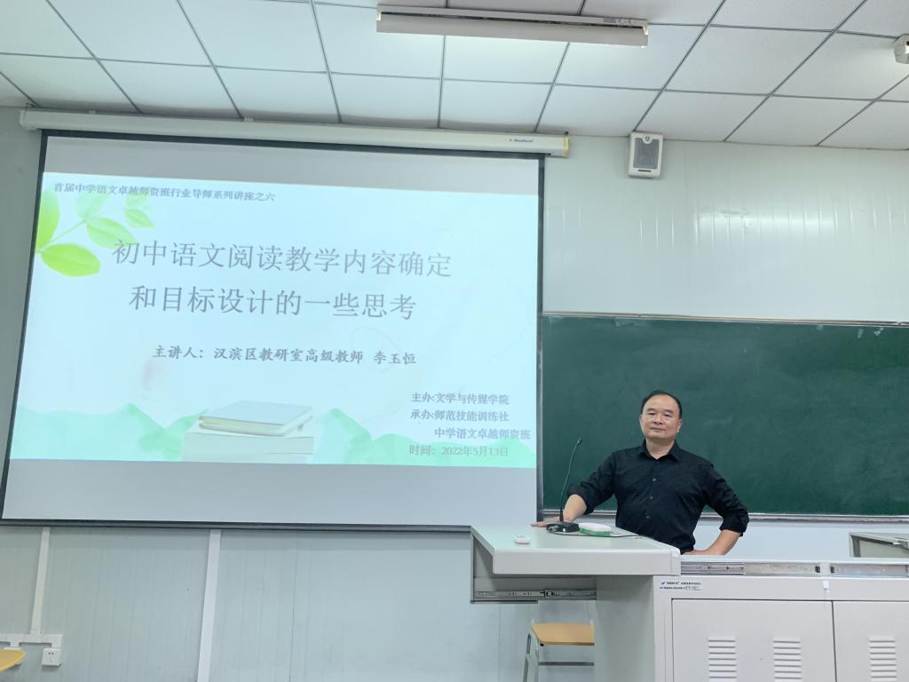 按照“中学语文卓越师资班”人才培养计划方案,5月13日下午四点半,我院特邀安康市汉滨区教研室高级教师李玉恒老师在1024教室开展了题为“初中语文阅读教学内容确定和目标设计的一些思考”的专题讲座活动,活动由中学语文卓越师资班班主任张格瑄老师主持。
