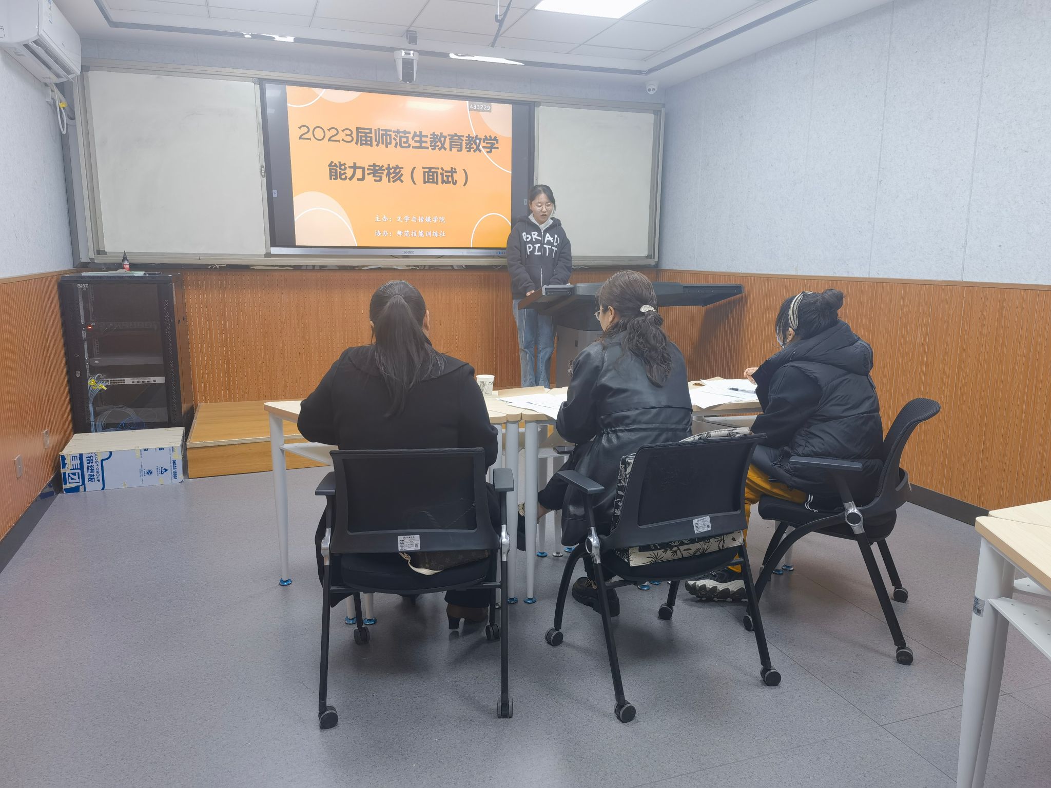 2023年3月18日下午,伟德国际victor·1946源自在江南校区师范生技能训练中心组织开展了2023届师范生教育教学能力考核(面试)工作。本次面试考核由学院师范技能训练社承办,特聘汉滨初中语文教师陈岩以及学院教师王丽芳、张格瑄担任考官。